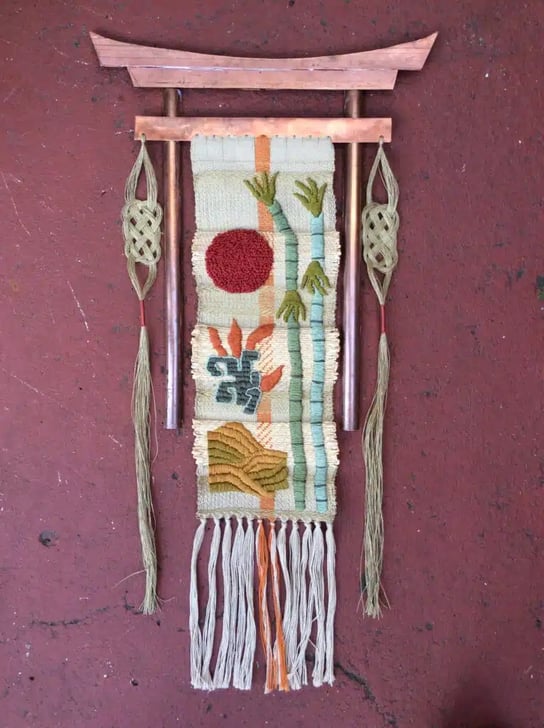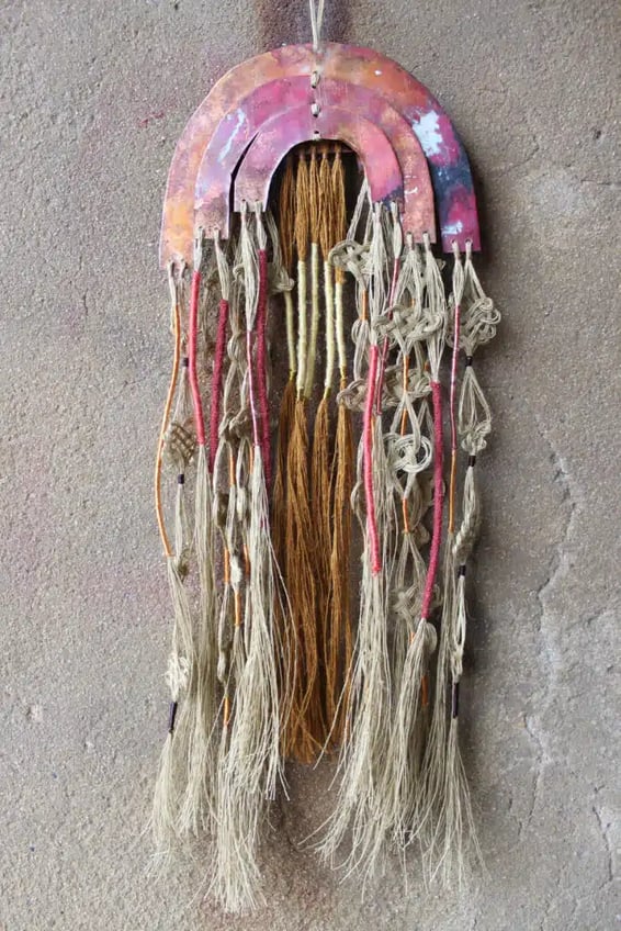 Inspired by her travels and different cultures, Alice’s work combines embroidery, wrapping, knotting and hand weaving on her Harris floor Loom. She experiments with unusual materials of recycled copper, raffia and 1970’s vintage silk yarns to create wall decor, hanging copper moons, clutch bags and Textile earrings. Vanderhume is about collaboration and creating contemporary Textiles and is named after Alice’s ancestors, Flemish weavers.